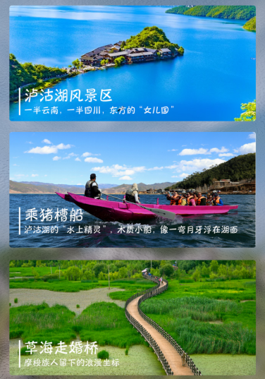 最好的视角去欣赏泸沽湖最美的景色➱【泸沽湖观景台】(观赏约 15-20 分钟)。乘坐摩梭人独特的交通工具➱猪槽船登临➱里务比岛/尼赛岛/鸟岛(看导游安排,游玩约 60 分钟,含猪槽船)从原始森林的林荫下走过,聆听着摩梭人诉说阿云山的传奇故事。乘车环游泸沽湖,途径➱里格半岛、情人滩、草海、走婚桥。今晚为贵宾安排摩梭族文化体验➱摩梭走婚宴/摩梭篝火晚会了解摩梭人传承了 1500 多年的母系氏族风俗。后入住酒店。