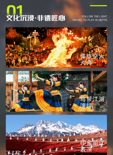赠送观看大型实景演出【印象·丽江-雪山篇】(特别告知,赠送项目,如遇景区表演场次调整,场次安排与行程冲突,导致《印象·丽江》无法观赏,将更改为《丽水金沙》(赠送费用不看 不退)(PS:景点前后顺序会根据当天实际情况以导游安排为准)感受一场真正意义上的荡涤灵魂的实景演出盛宴。第一部分“雪山篇”是与山的对话,体验生命与自然的紧密关系;第二部分是通过人们攀登玉龙雪山,游历丽江古城,从而与生活对话;第三部分“古城篇”是与祖先的对话,在对话中发现古往今来在人们的内心深处,始终存在一个神圣的王国