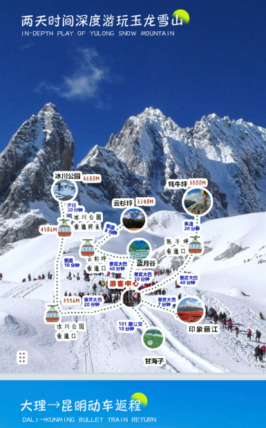 指定时间出发去【玉龙雪山】风景区游览。乘【冰川公园大索道】(赠送氧气和防寒服)尽情的饱览玉龙雪山风光,登临雪峰,穿越寒暑和云层,纵览四季交替景观,更有萦绕身侧的云卷云舒,从高处俯瞰雪山万物,感受玉龙奔腾入江的震撼气势,玉龙雪山最高海拔5596米,终年披云戴雪,气势磅礴。登临雪峰,饱览姿态万千的雪域风光,抒发一览众山小的凌云壮志;万年不化的冰川近在眼前,云南秀美横断山脉,一览无遗……(玉龙雪山冰川公园大索道严卡时间安排,需提前订票,一旦锁定时间无法更改和退还,还请各位游客朋友配合游览安排时间。另由于不可抗因素或淡旺季索道配额等情况无法正常游览冰川公园大索道,我们会根据当天实际情况做备选方案调整改走小索道云杉坪或中索道牦牛坪或改无,并根据实际情况退索道费用)